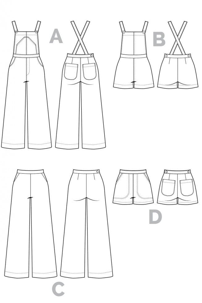 Make a more sophisticated version of dungarees with our well-proportioned bib and optional utility pocket, or omit the bib entirely and make a pair of wide-legged cropped pants, full-length pants or shorts. Optional details abound; mix and match the curved slash front pockets, faux fly front, single or double zipper waistband and rounded back patch pockets. To personalize even further, go all out with high contrast topstitching, or take a more minimalist approach for a clean, elegant finish.
