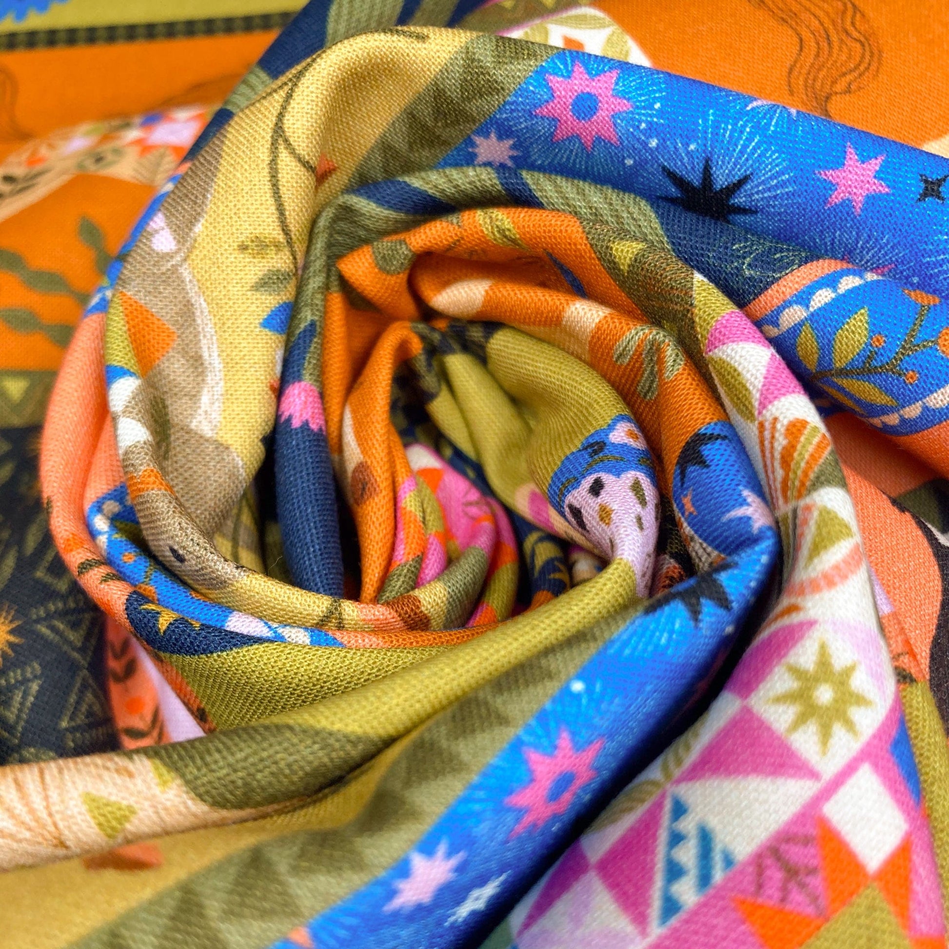 A high quality, classic quilter's weight cotton with a vibrant folkloric animal collage print in warm colours.