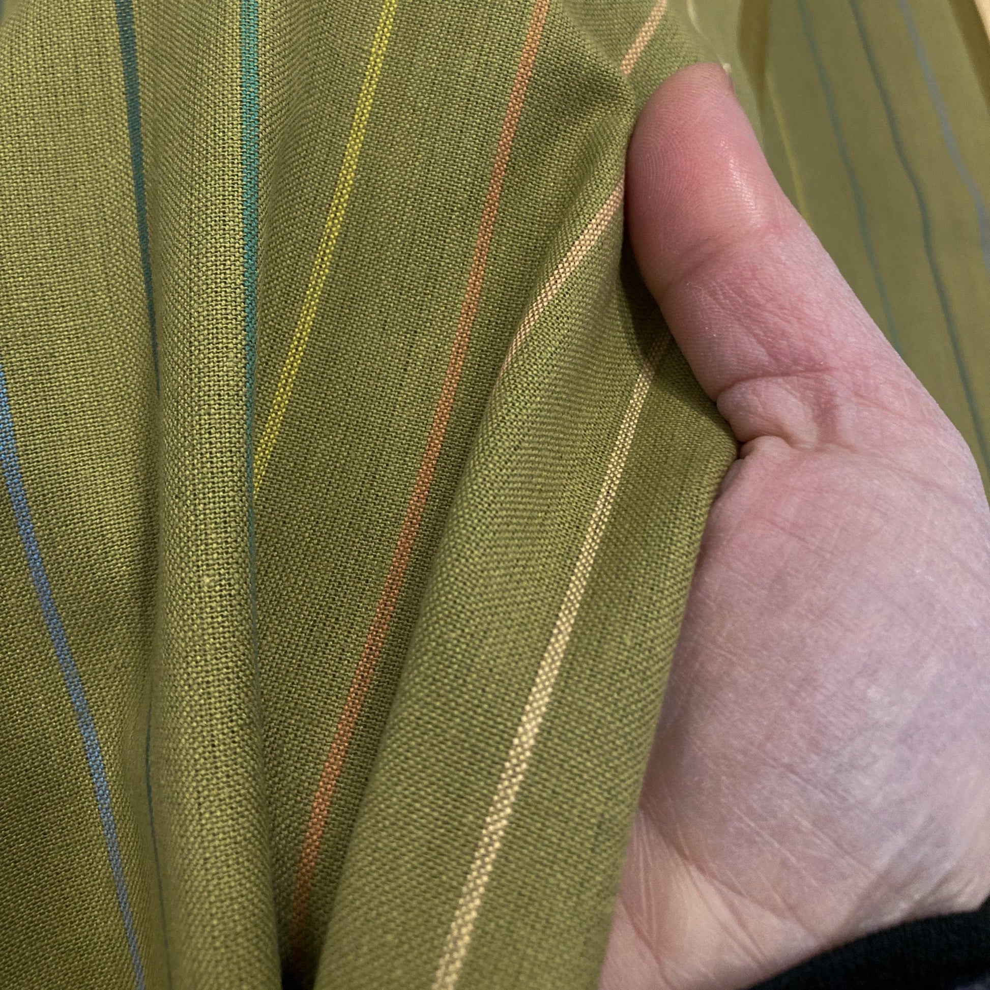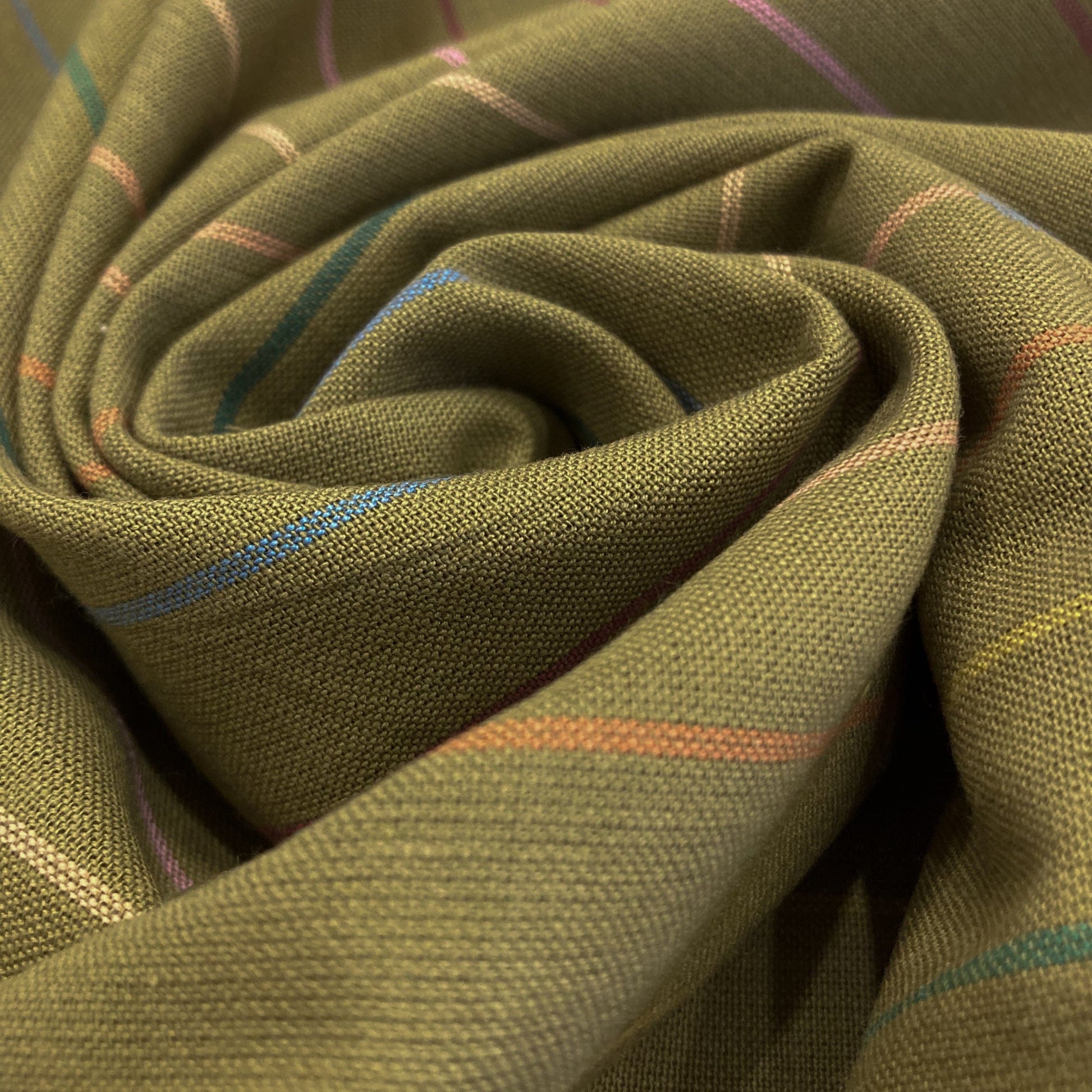 From the 'Lucky Loom' collection by Fableism, this is a soft yarn-dyed cotton with a multi-coloured skinny stripe pattern on an olive green background. The fabric looks the same on the reverse so it's great for makes where both sides of the fabric are visible. The spacing between the stripes is 2cm.