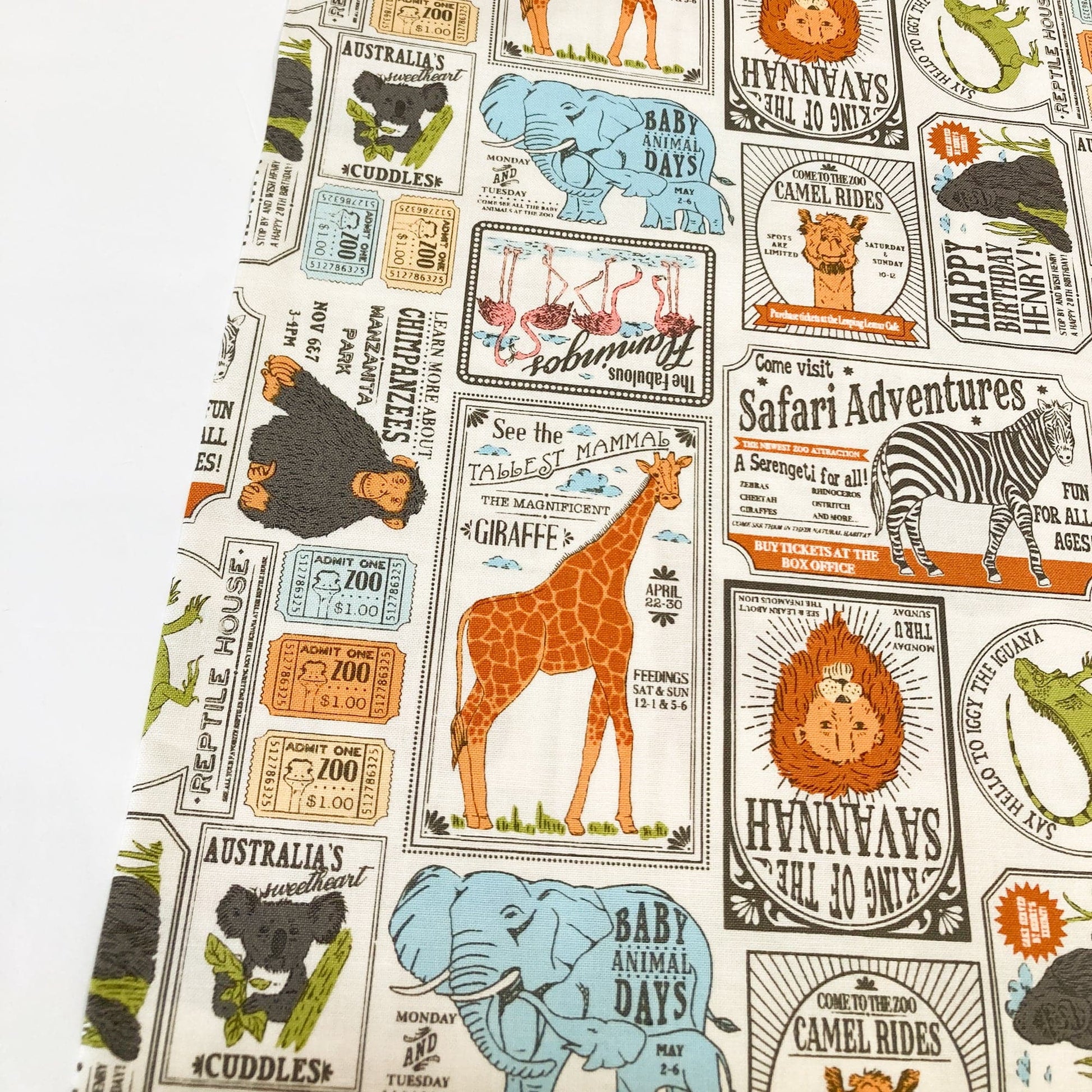 From the collection 'Animal Park Fun' by Stacy Iest Hsu for Moda Fabrics, this is a delightful collage style vintage zoo design.
