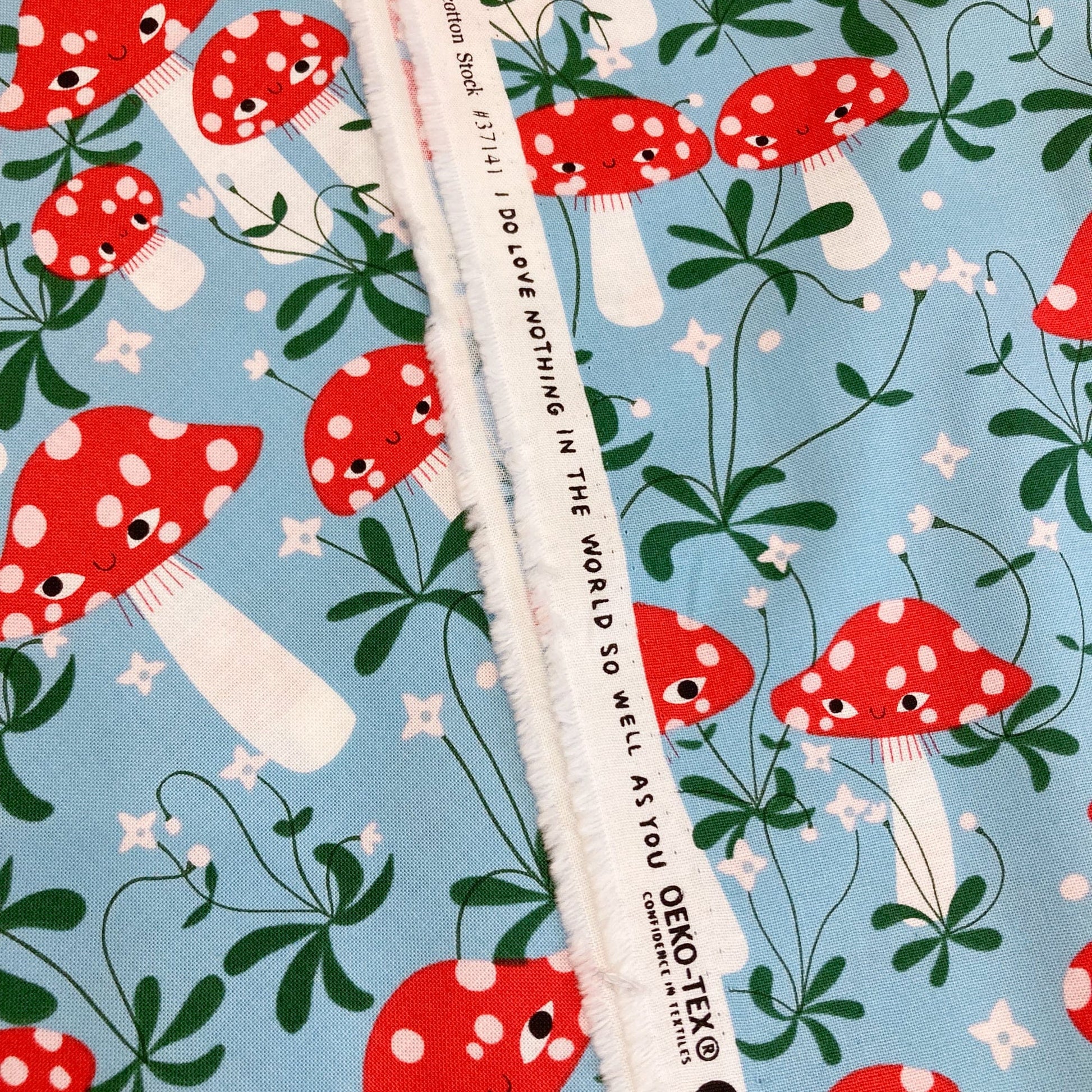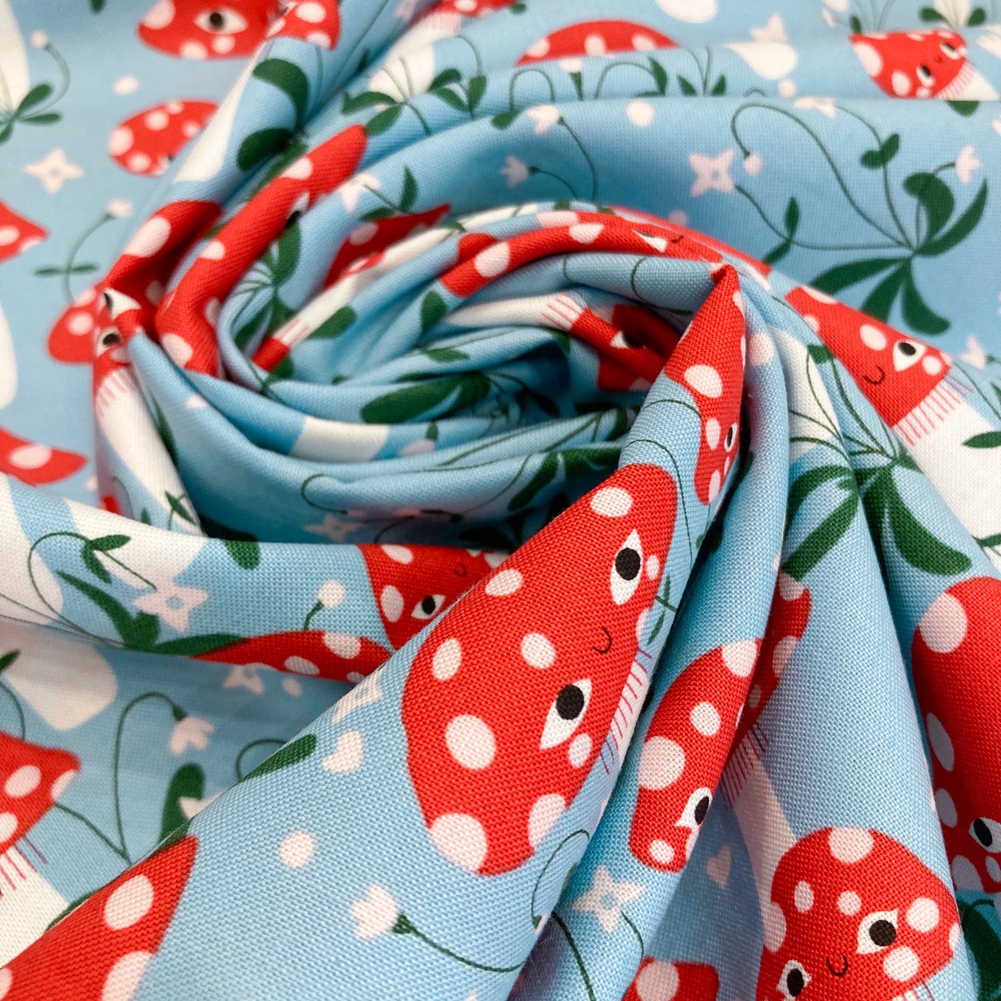 From the collection 'Funny Valentine' by Lizzie House for Moda Fabrics, this is a super cute mushroom print in classic red and white on a sky blue background.