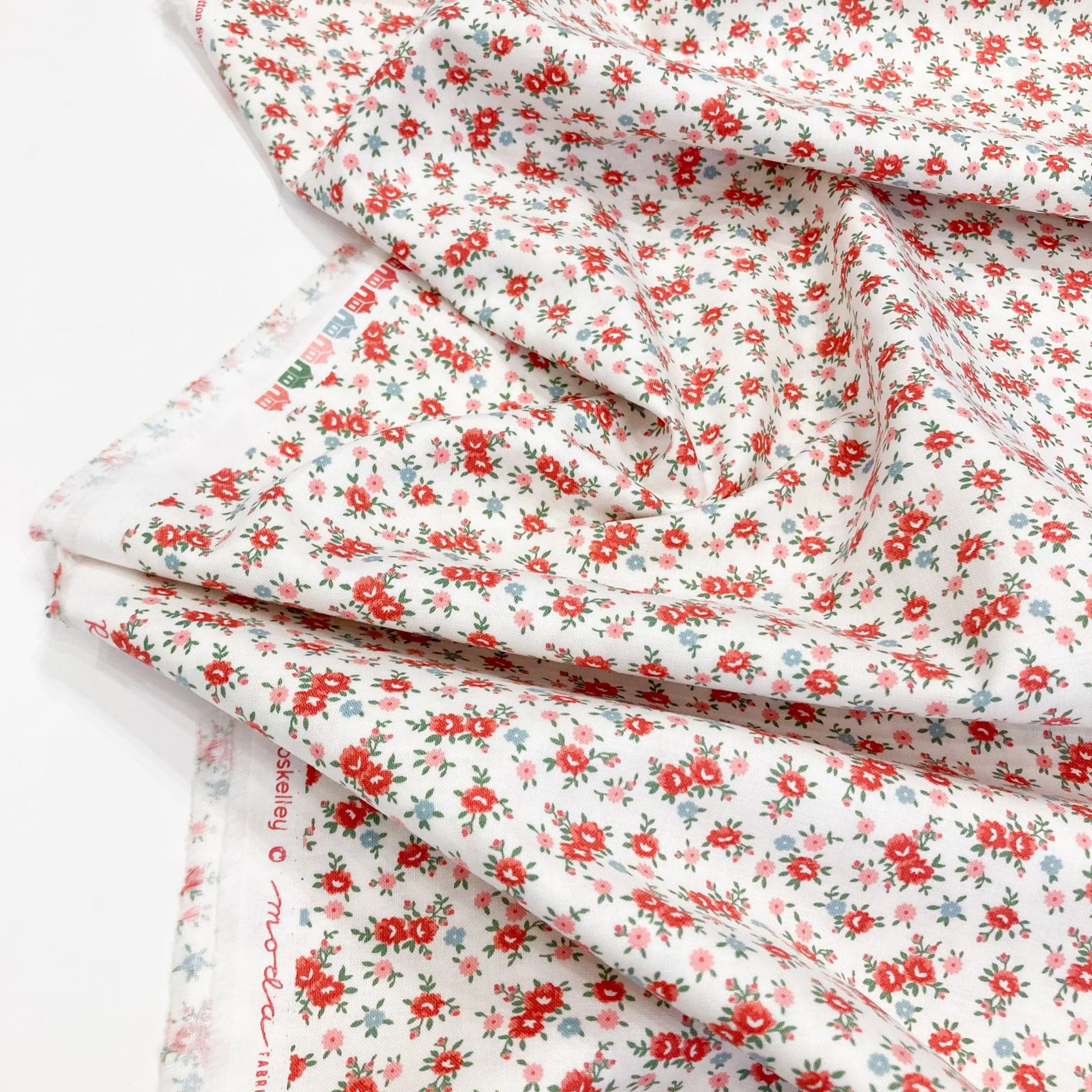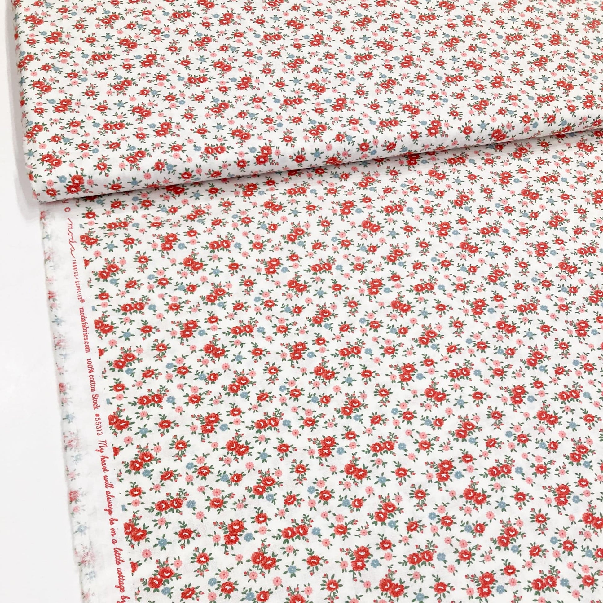 A high quality classic quilter's weight cotton from Moda's lovely collection 'Rosemary Cottage'. It's a classic ditsy floral print in red on cream and works very well for Christmassy makes (it's lovely combined with Moda's Magic Dot in Strawberry, or our red gingahm) as well as the rest of the year round.