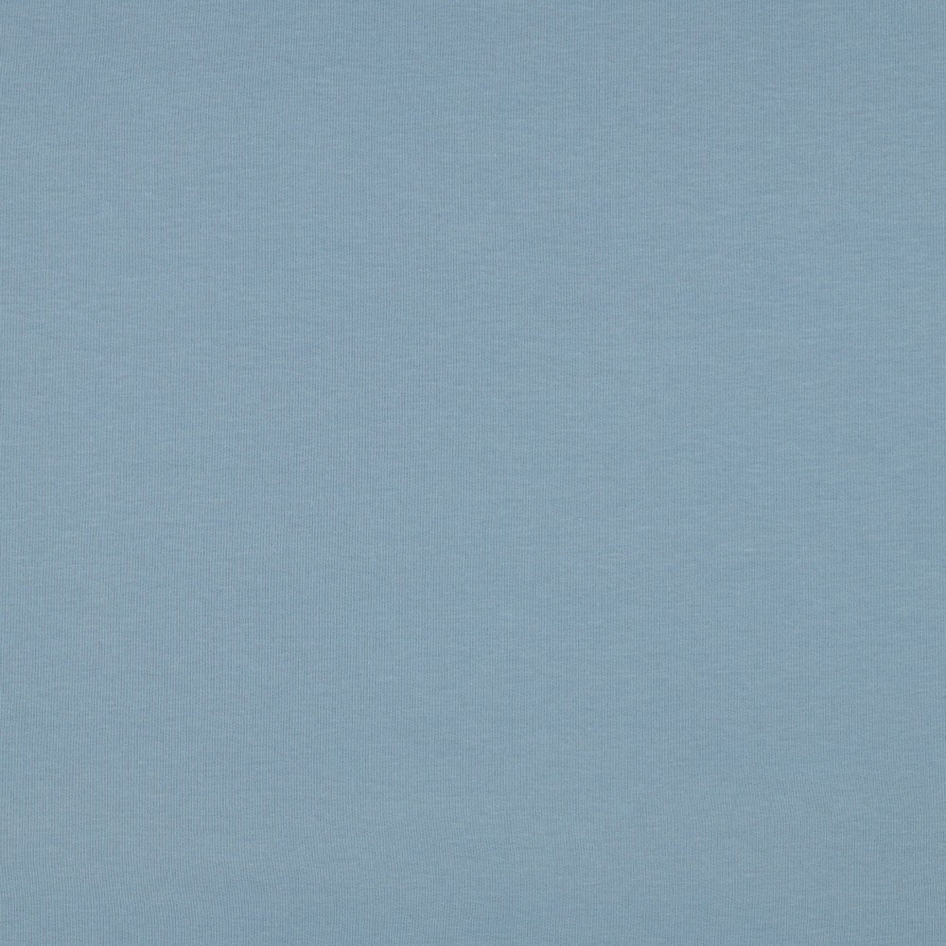A lovely soft organic cotton sweatshirt jersey fabric with a snuggly, brushed back in a soft, slightly muted sky blue.