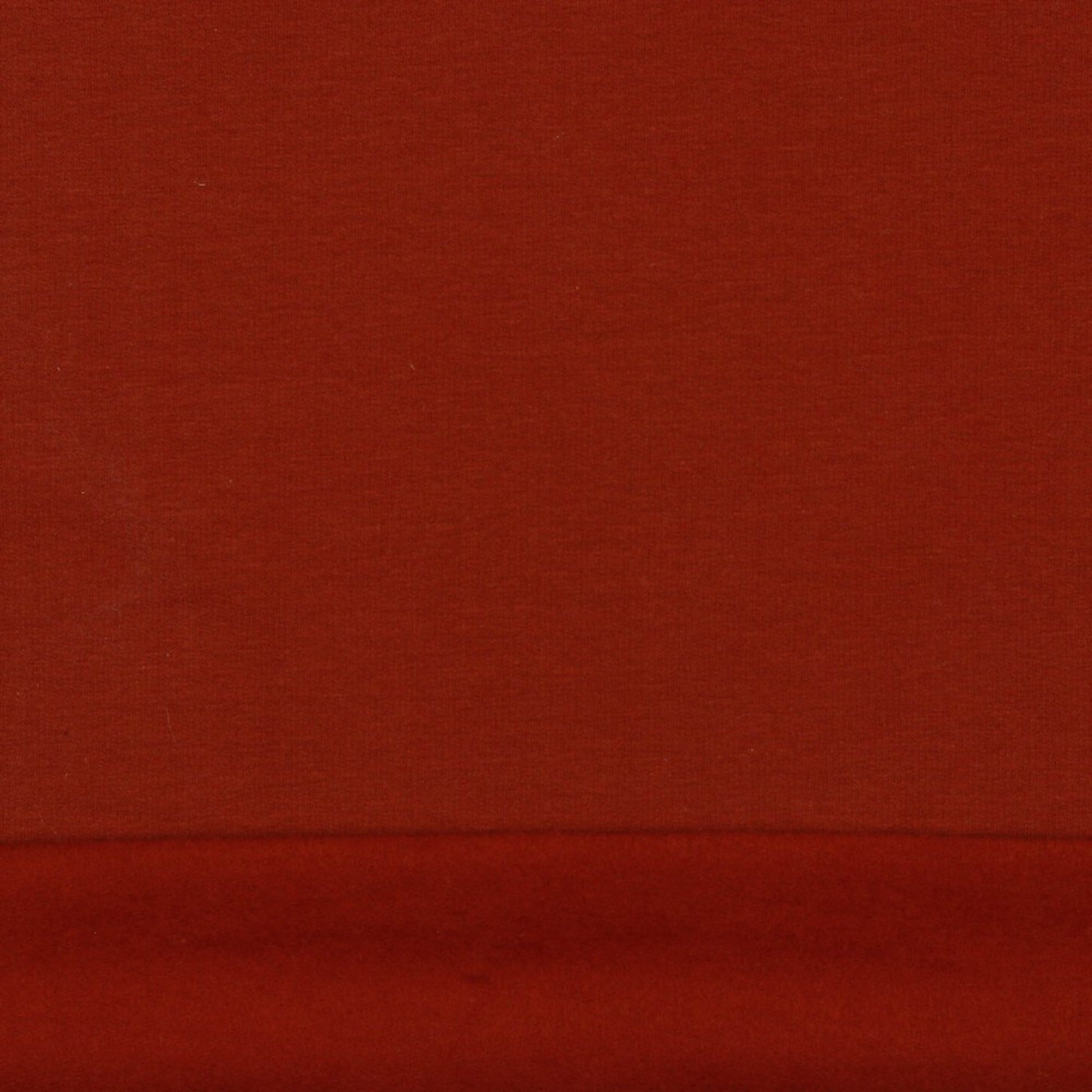 A lovely soft organic cotton sweatshirt jersey fabric with a snuggly, brushed back in a warm terracotta red.