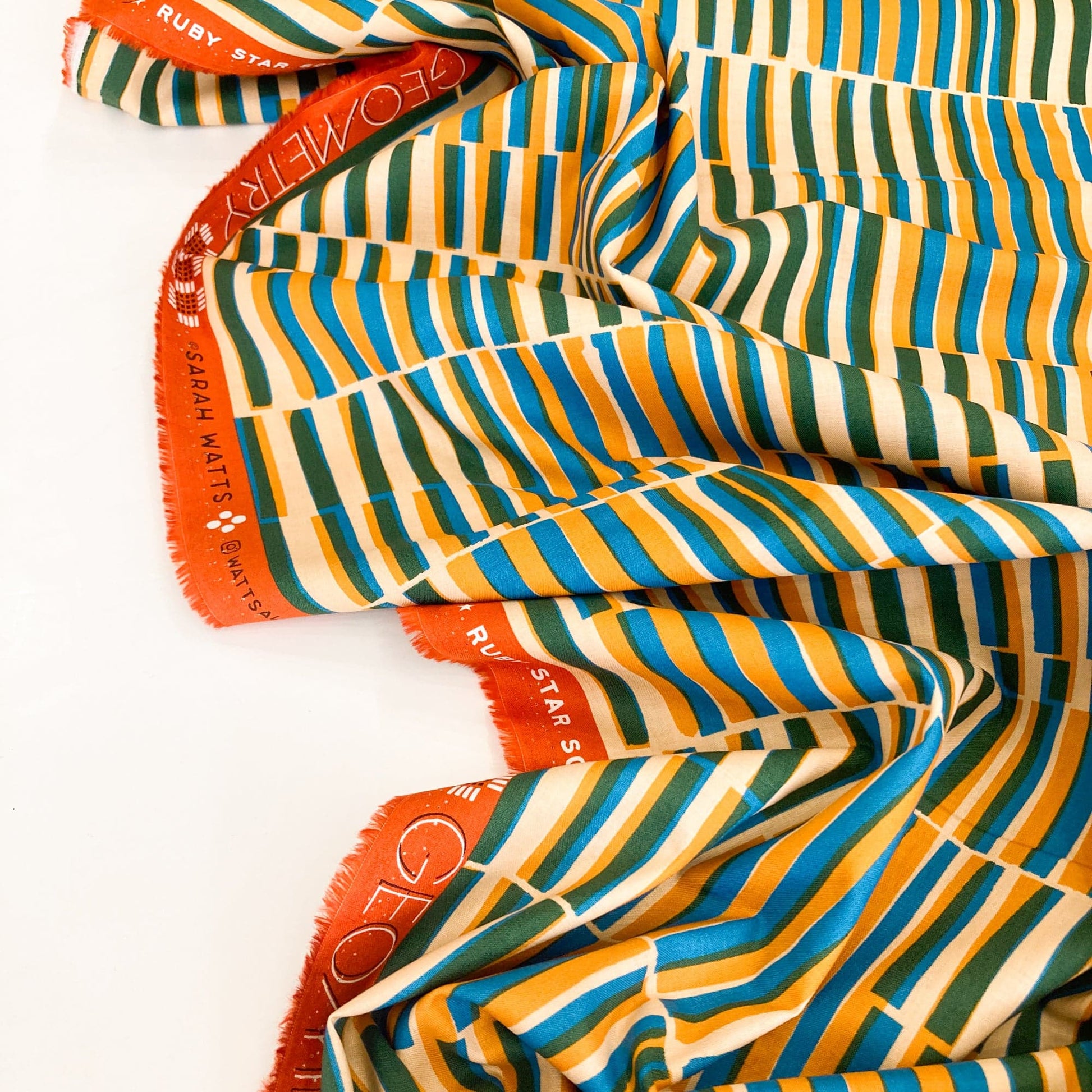 From Ruby Star Society's collaborative midcentury modern-inspired 'Geometry' collection, this is 'Ladders', a cool, retro geometric print in mustard, green and blue.
