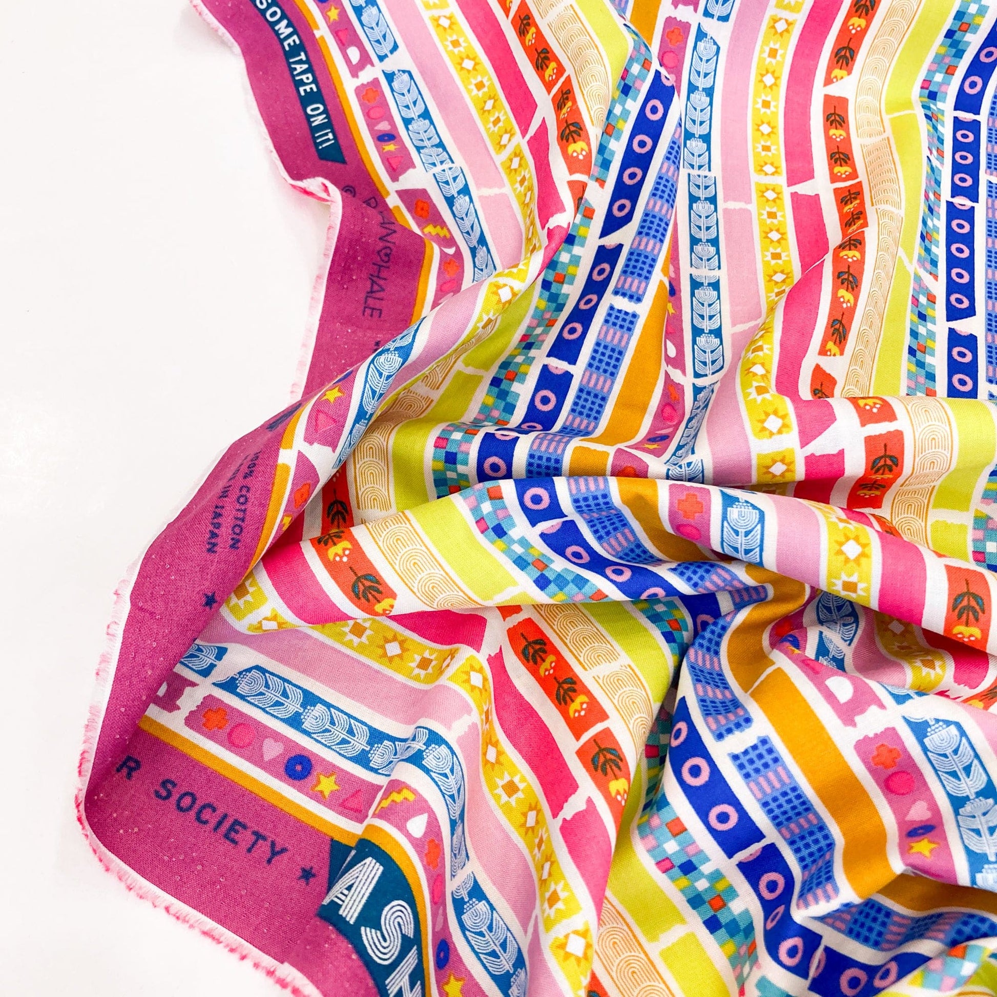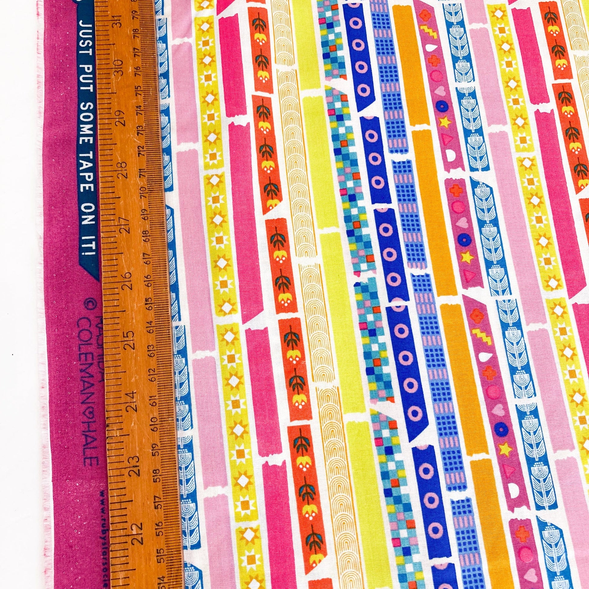 From Rashida Coleman Hale's 'Washi Plus' collection for Ruby Star Society, this is a medium weight cotton fabric with a lovely washi tape stripe in vibrant colours on a cream background.