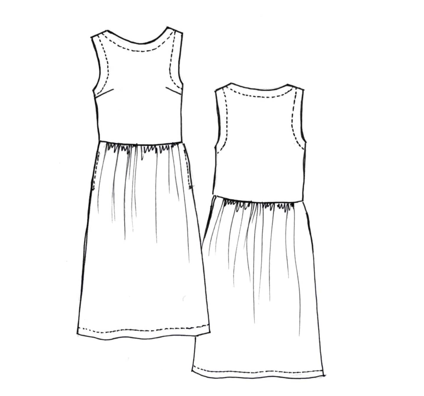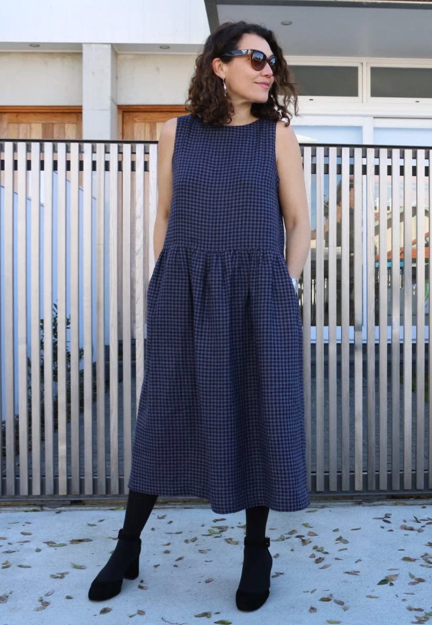 The Felicia Pinafore Dress is a pull-on pinafore style featuring a sleeveless bodice with stitched down neck and armhole facings, bust darts and a soft gathered skirt with side pockets. A great dress for every season, Felicia can be worn on her own or over a t-shirt or long-sleeved top.